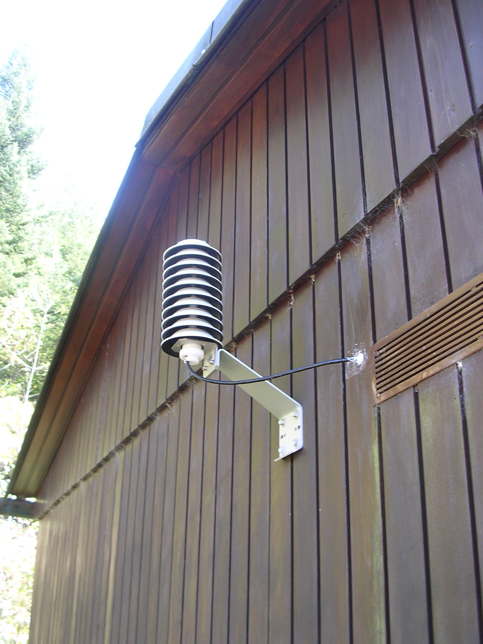 The Vaisala temperature and humidity sensor mounted on the north wall of the magnetics hut. Here it gets very little direct light from the sun.