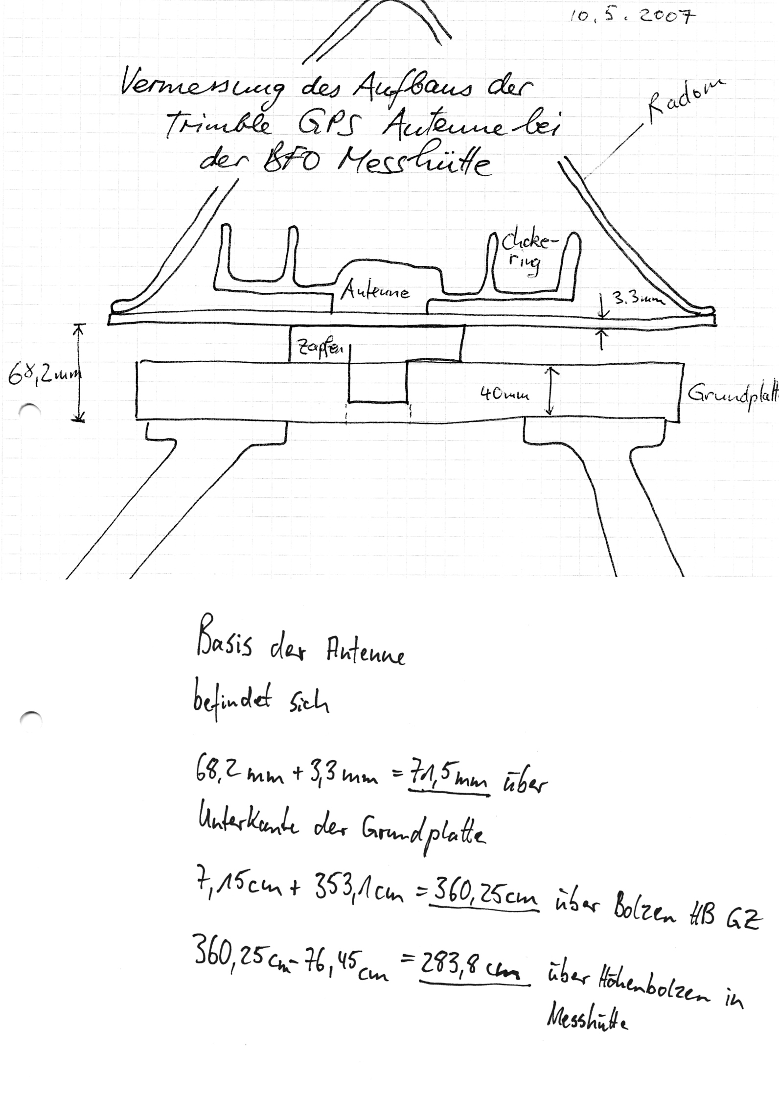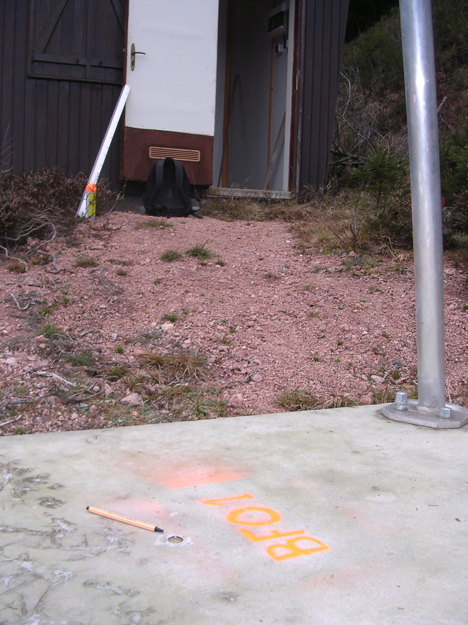 The height of the antenna relative to a geodetic/gravimetric height marker inside the magnetics hut has been determined in april/may 2007.