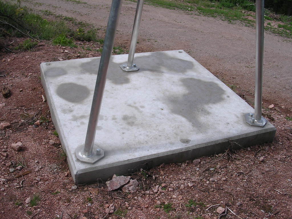 The 2m by 2m concrete foundation with the tiny geodetic marker underneath the antenna. The pier sits on slightly weathered granite which was excavated to a depth of 1m below the surface.